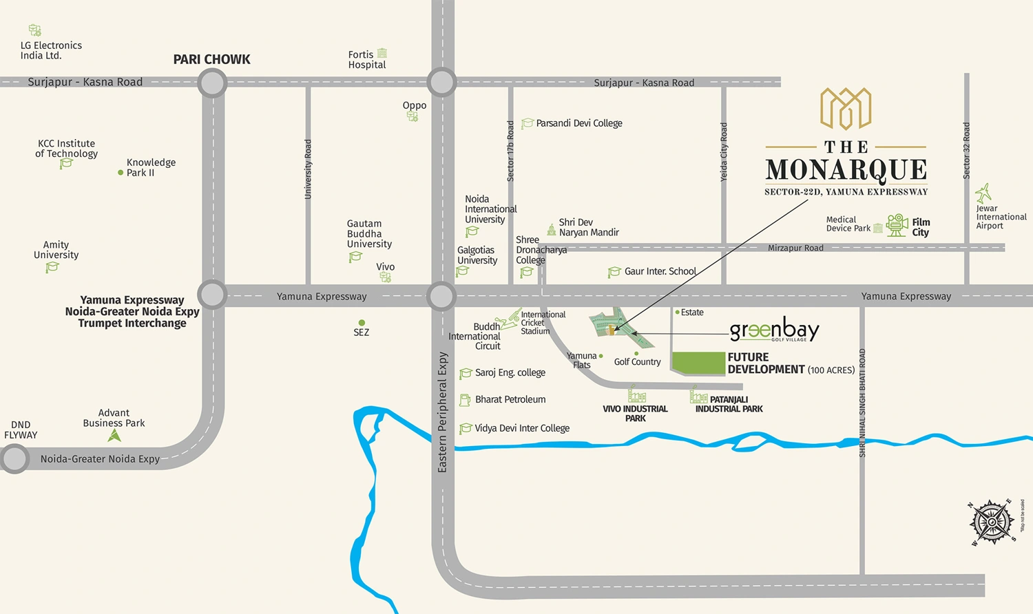 Located on the Yamuna Expressway, Greenbay Golf Village Sector 22D Yamuna Expressway offers seamless connectivity to Noida, Greater Noida, and Delhi. Just minutes from Jewar International Airport, the project ensures quick access to Agra and Mathura, while being surrounded by wide roads, urban conveniences, and future growth opportunities.